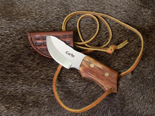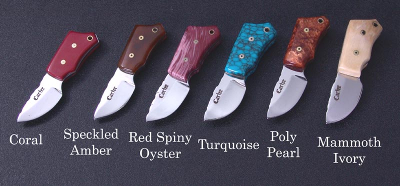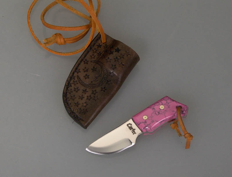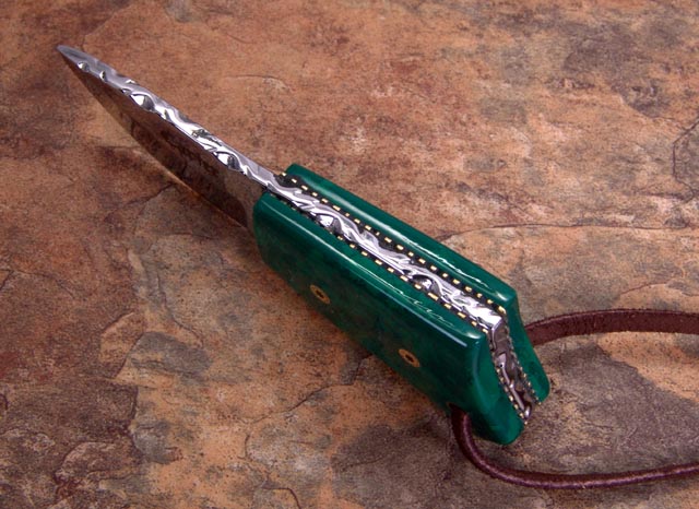 My most popular knife. These little neckers are great for hikers and campers. Some of the ladies even wear them as accessories because of the beautiful handles. I usually make the handles from reconstituted gemstone material like jade, jasper, turquoise, azurite, malachite, onyx, agate or rhodonite. Reconstituted gemstone is 85% crushed stone mixed with 15% polymers to retain the look but make it less porous and brittle. I also use some natural materials like amber, spiny oyster shell, buffalo horn, giraffe bone or mammoth ivory.