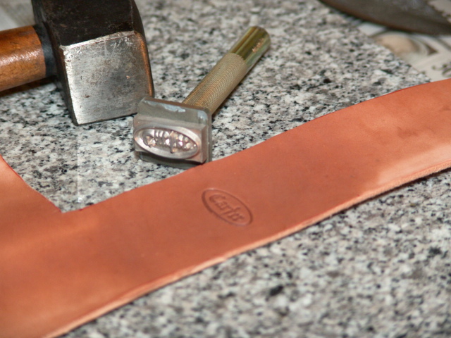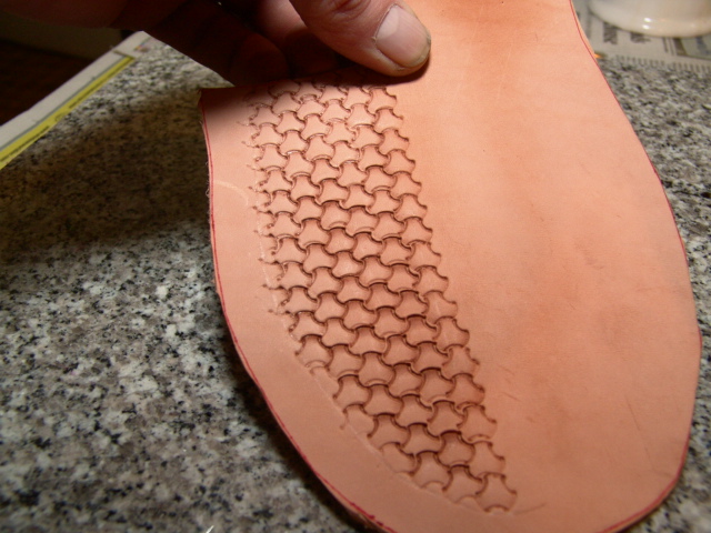 Next, I moisten the leather so I can stamp by mark and a basket weave pattern.