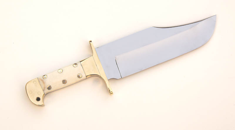 The handles are attached with "birdseye" pins. These are steel screws threaded through countersunk brass collars. When ground down, they have a silver center surrounded by a brass ring. Since the brass collars are countersunk into the bone, it makes a very secure handle.