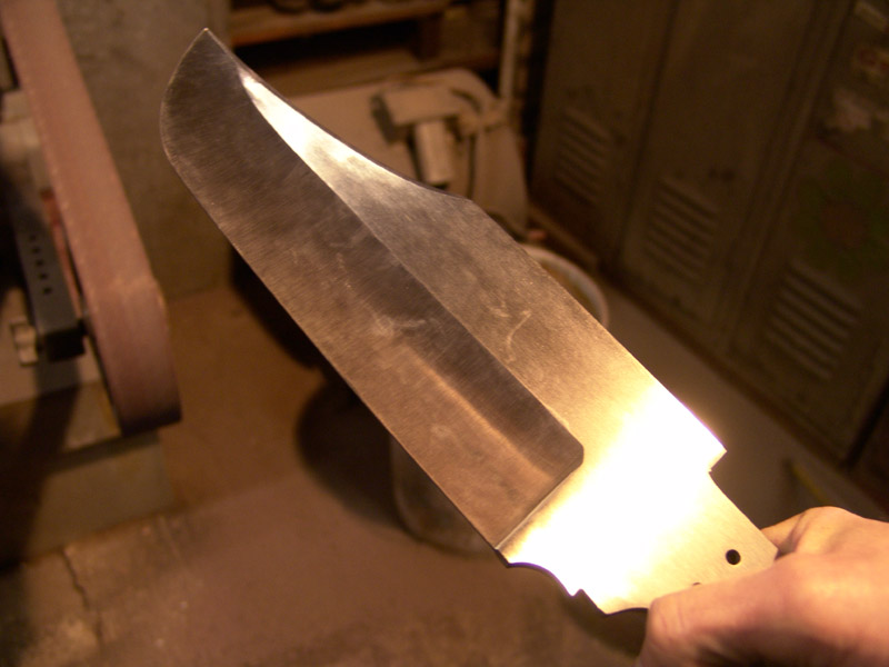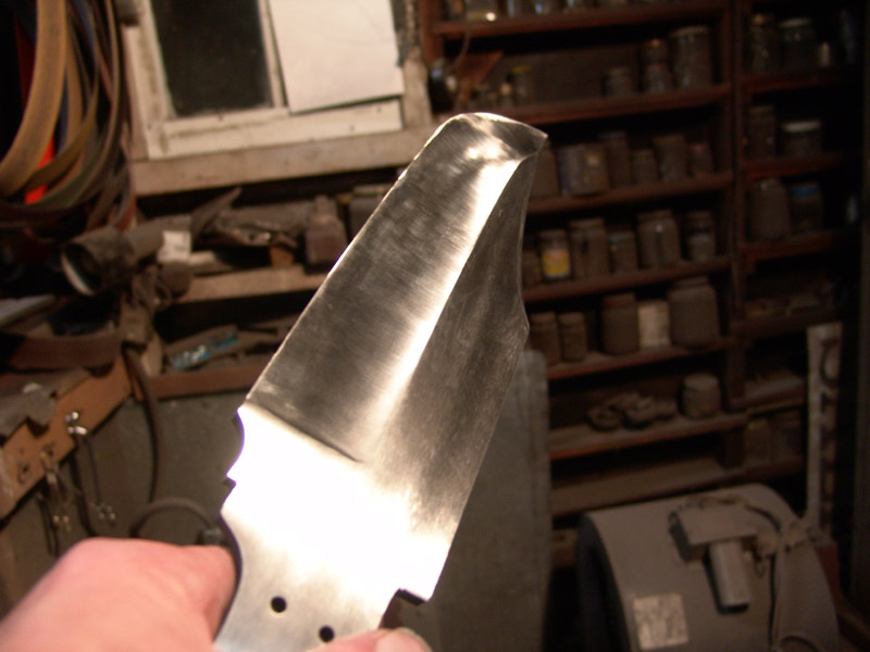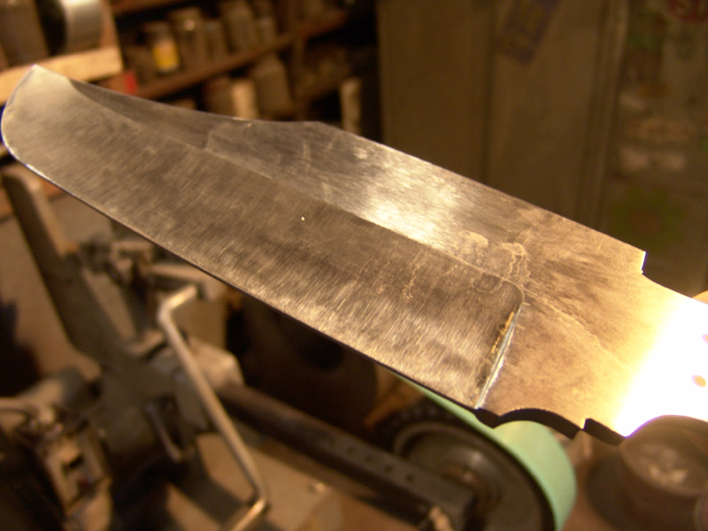 After heat treatment, much more grinding is required and it is a slower process since I am now grinding hardened steel with successively finer grit belts to remove all scratches from the blade.