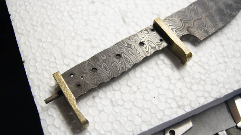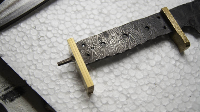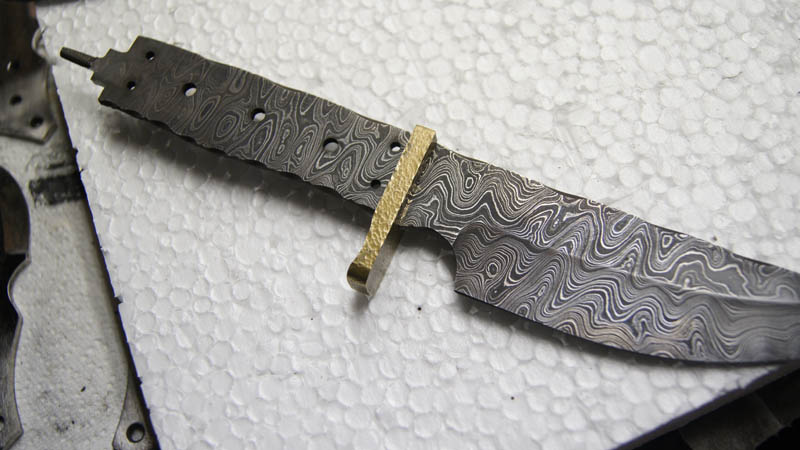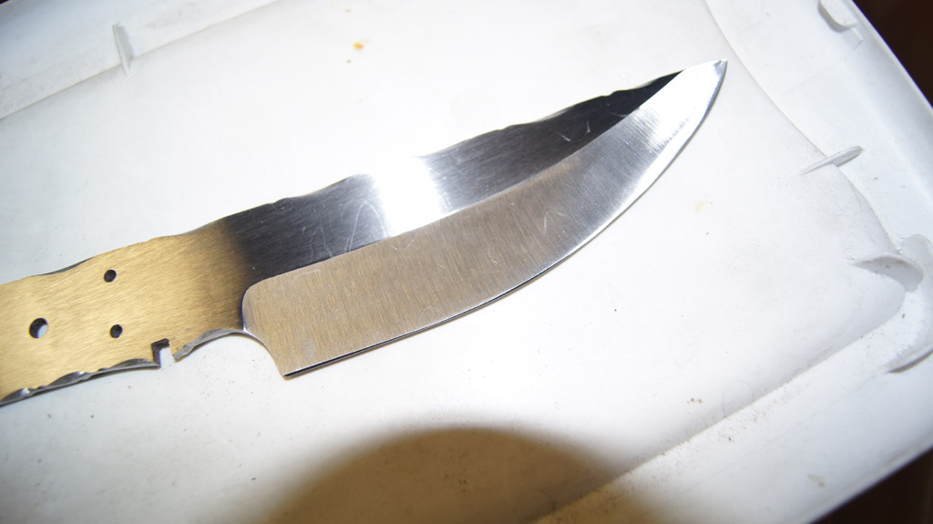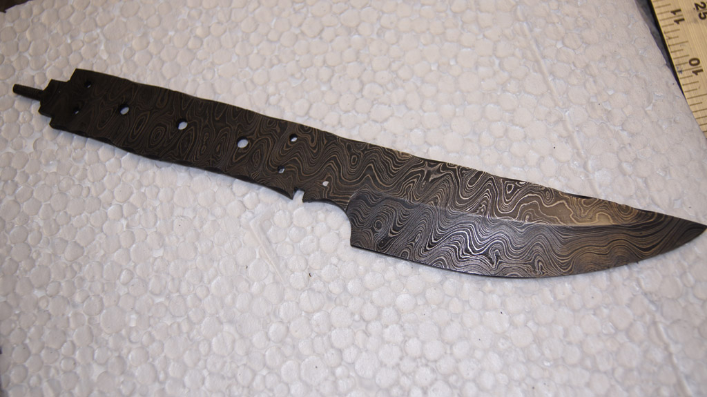 Here the blade has been rough ground, heat treated, and final ground. This is Alabama Damascus made by Brad Vice. It is 416 layers of four types of steel. Acid is used to etch the steel and bring out the pattern as the acid reacts differently with the different types of steel. This is how it looks before acid etching.