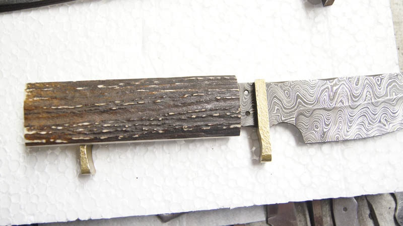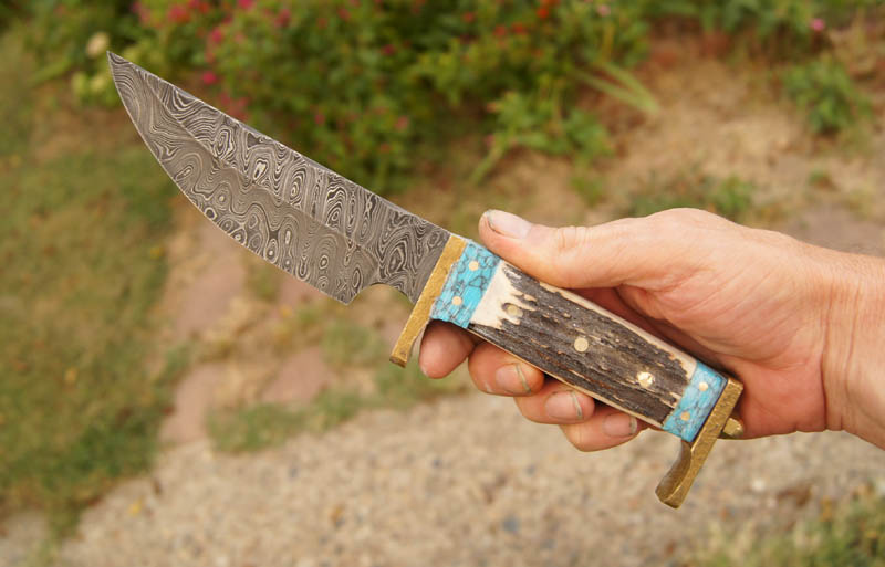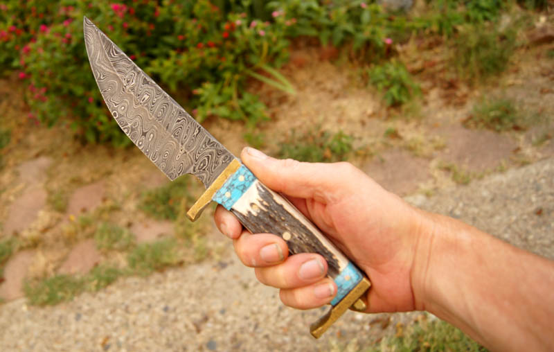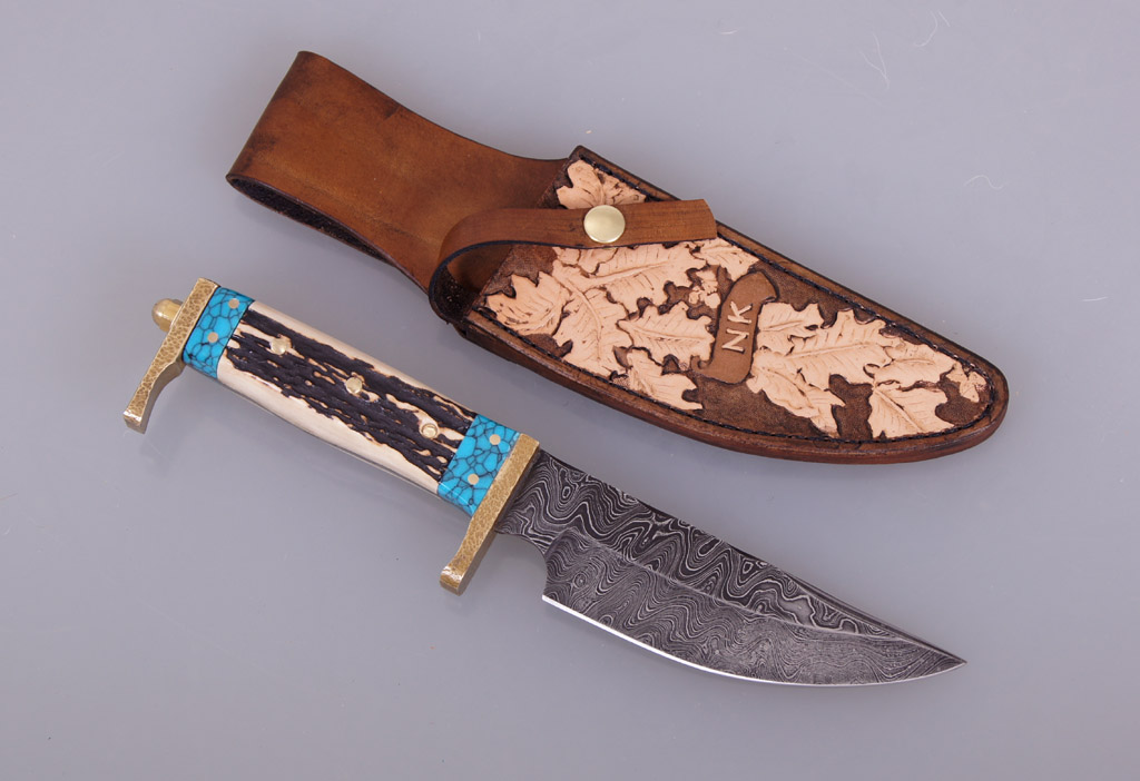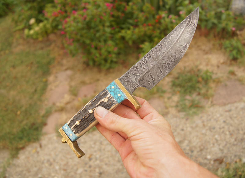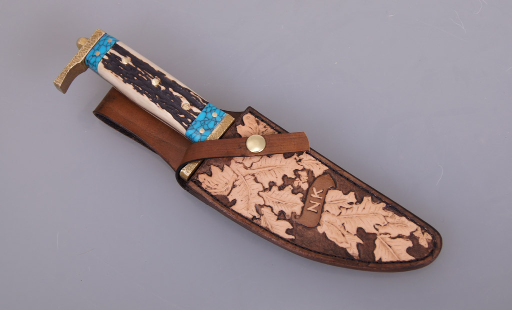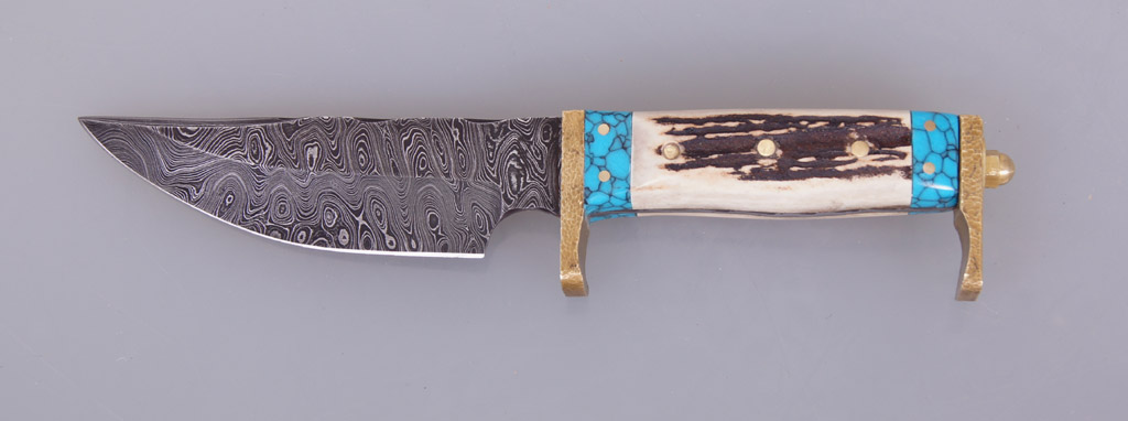 This is a unique design. We discussed several options and decided on stag handles with turquoise bolsters and antiqued brass guards.