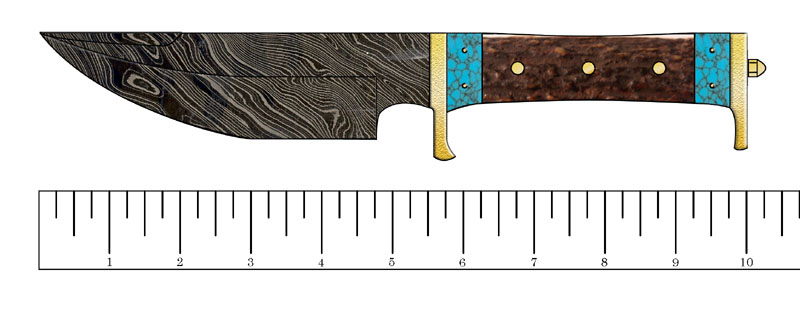A customer ordered a custom 10" Damascus knife based on his design. He calls it "Druid". Working from his sketches, I drew up a computer generated drawing that also serves as a template for cutting the parts.