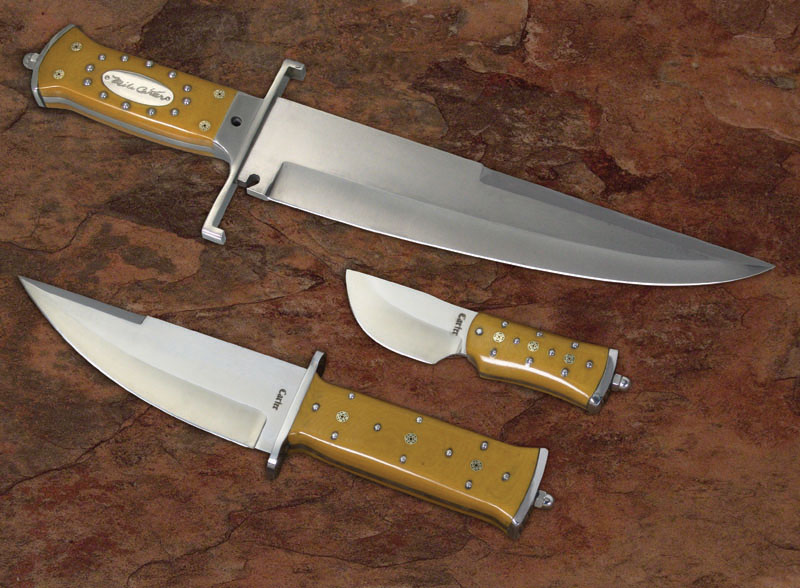 This set is based on the customers sketches. We made a couple of changes along the way but the results are pretty true to his original idea. All three knives are made from 440C stainless steel with handles of butterscotch linen Micarta. Each is adorned with domed stainless steel pins and mosaic pins.