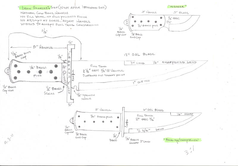 All three knives will have a common theme with butterscotch linen Micarta handles, mosaic pins and domed stainless steel pins. As always, I converted the drawings to Photoshop so I could design and print out full size templates with accurate measurements.