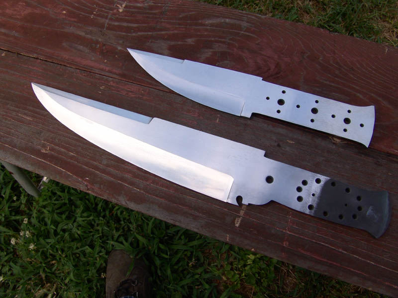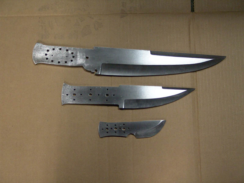 Once we have the design pretty much finalized it is time to start cutting steel. Here the blades are cut, drilled, rough ground and ready for heat treating.