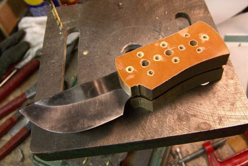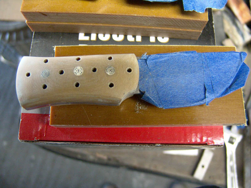 I use the holes in the handle tang as a template for drilling the pin holes in the Micarta and temporarily install pins to align the holes.