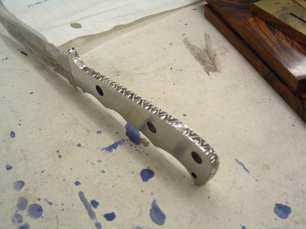 grind the blade after heat treatment. I drill the holes for the pins that will
