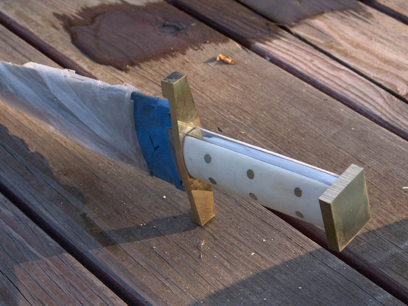 I finally found some nice scales and got back to work on Kong II. Here, the bone handles are attached with brass pins, the guard has been tapered and now I am starting to make the butt cap. Since the blade has been mirror polished, I covered with plastic just to protect it from scratches while I finish the knife.