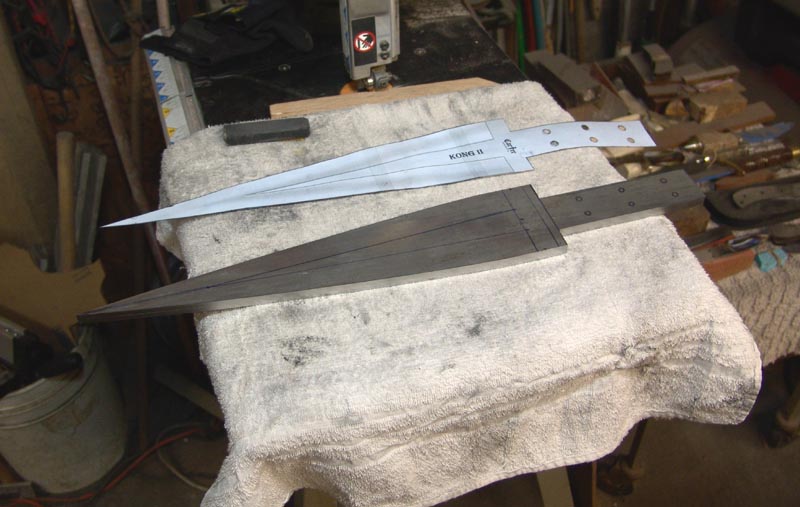 I start with a full sized paper print of my blade sketch and use that as a template to cut the 400C stainless steel from bar stock.