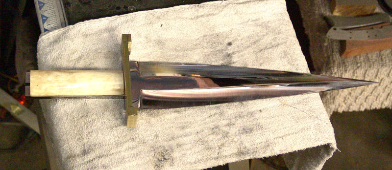 Here is a mock-up with the brass guard rough cut. I still have some more polishing and grinding to do. It is shown here with some camel bone handle scales but I think we will instead use some white giraffe bone.