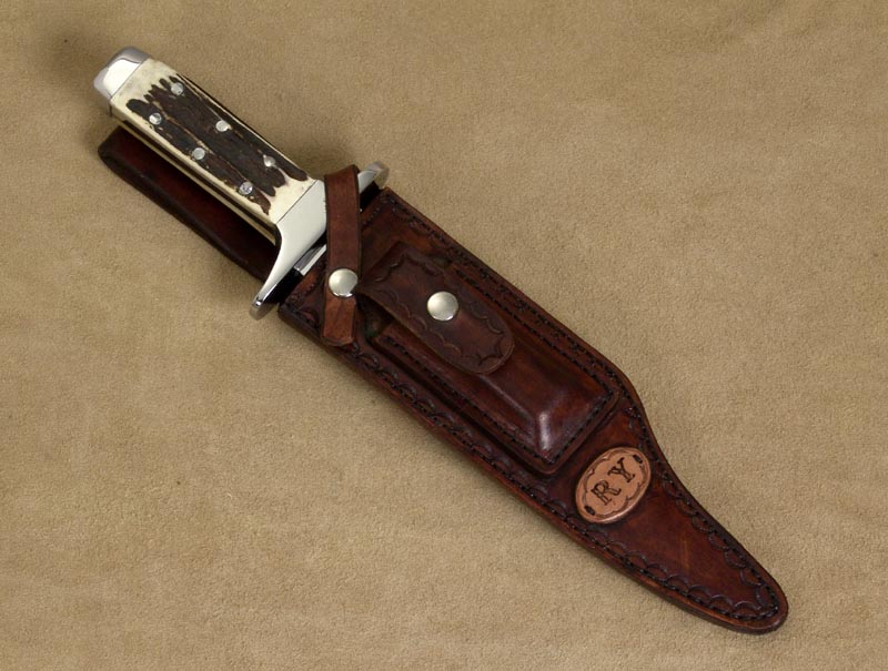 Richard wanted a special sheath personalized with his initials and a pocket for a sharpening stone. Here is the final package.