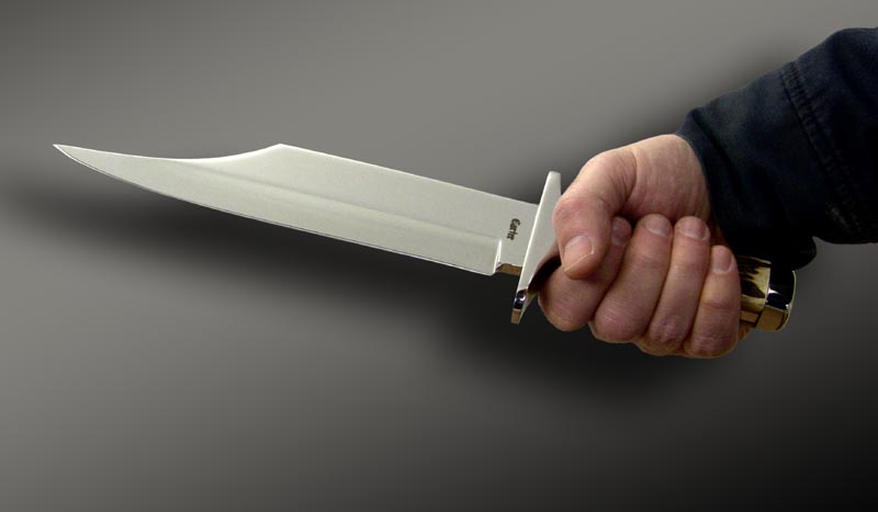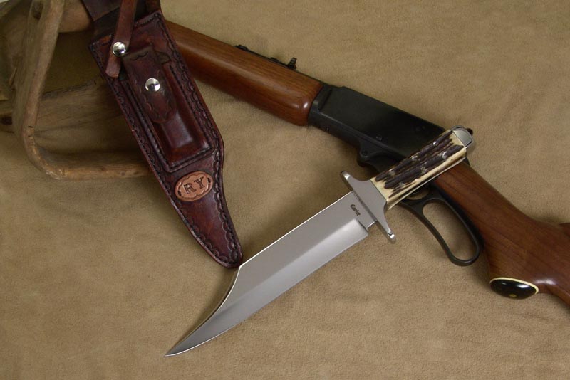 This is another variation of my "Grizz" and smaller "Grizz Jr." Bowie knives. This one has a 9" blade of 1/4" thick mirror polished 440C stainless steel. The customer, Richard, wanted some gnarly Sambar stag handles attached to the full tang with six stainless steel pins. I finished the knife with a polished stainless steel guard and end cap.