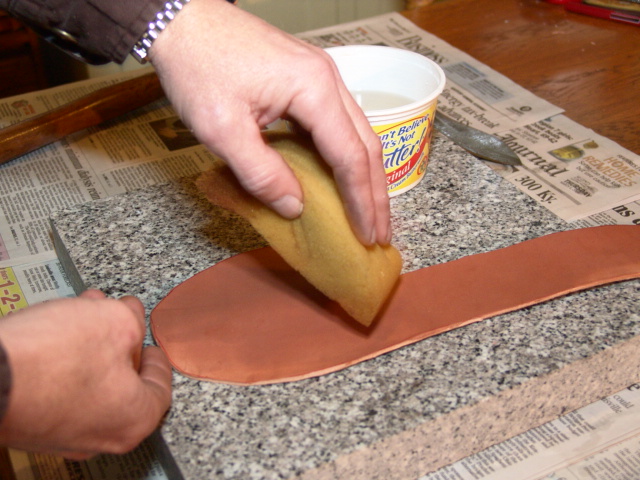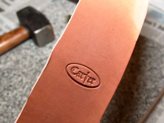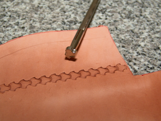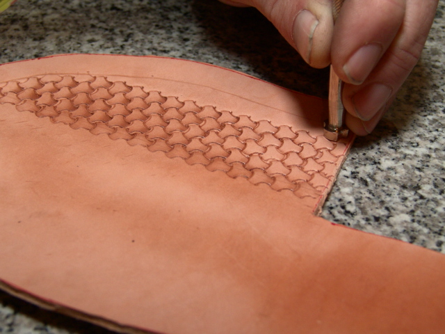 Next, I moisten the leather so I can stamp by mark and a basket weave pattern.