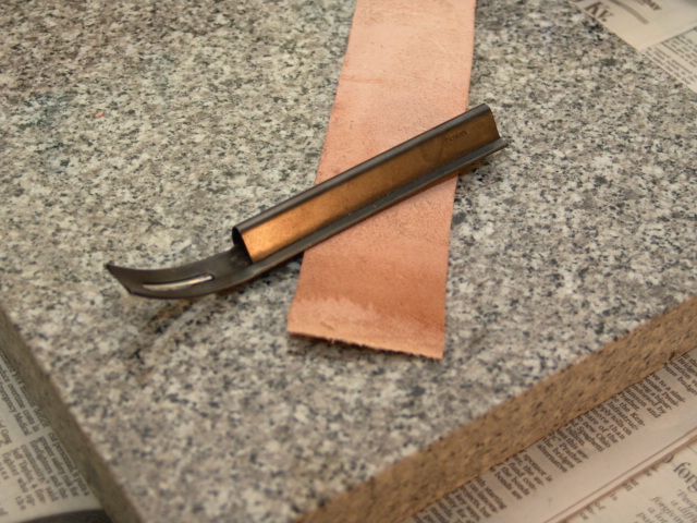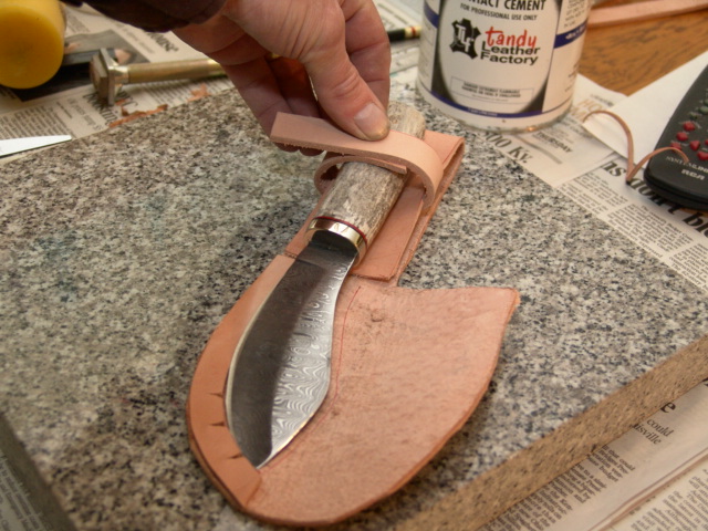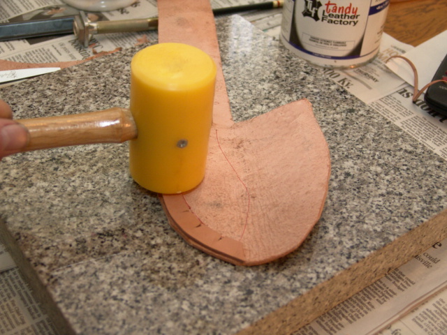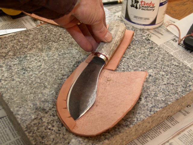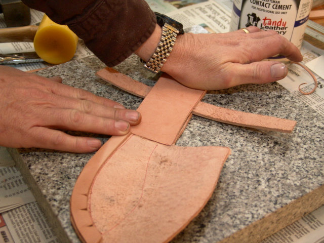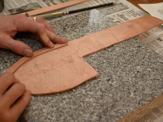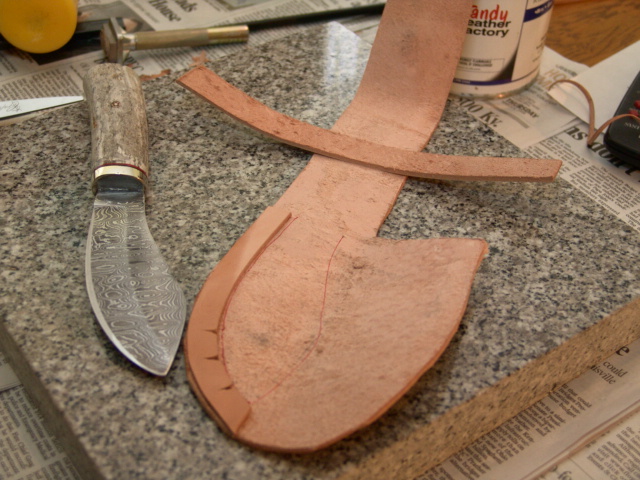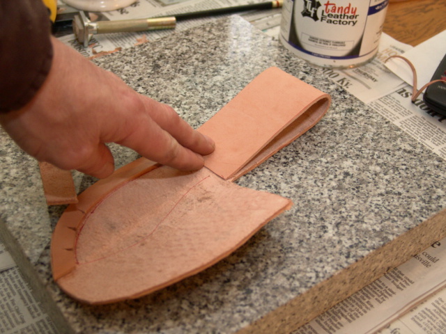 To help the leather make the tight turn around the tip of the blade, I cut a few "V" shapes.