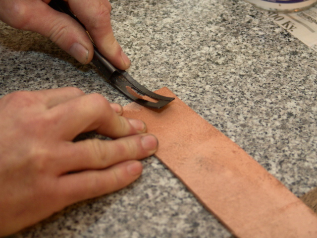 I cut a 3/4 inch wide strip of leather to make my retaining strap.