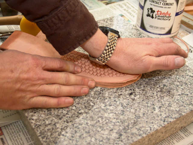 we have cut out our leather and stamped a basket weave pattern on the front of