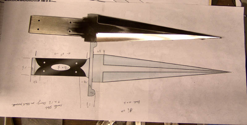 We start with a scale drawing. This will be a 14 1/2" dagger with a 10" blade, stainless steel fittings, nickel silver inlayed bolsters and a ivory inlay in the handle. It will have filework and black micarta handle scales.