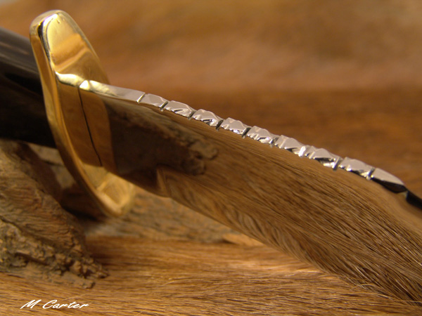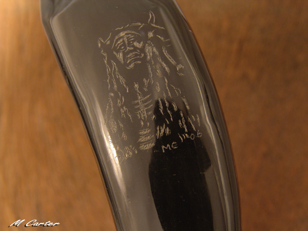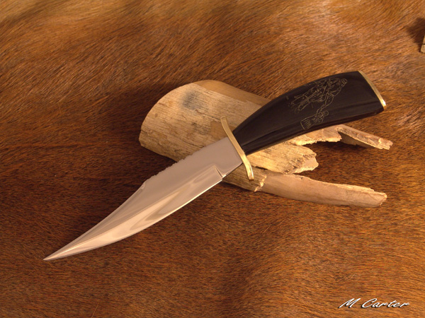 I am learning to scrimshaw so I decided to make a knife with a buffalo horn handle and try to reverse scrim the two pictures described above onto the handle. I also did a little file work along the back of the blade in a arrowhead design.