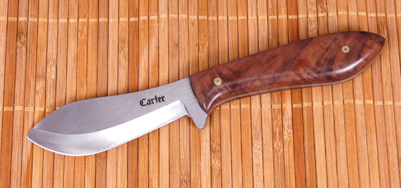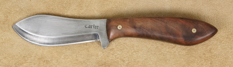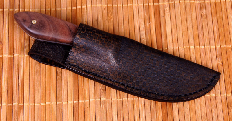 Black walnut handle with Mosaic Pins. Darkened blade. Leather molded pouch sheath. $75 US SOLD