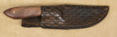 Black Walnut handle with Mosaic Pins. Molded leather pouch sheath. $75 US - SOLD