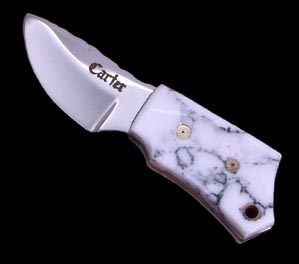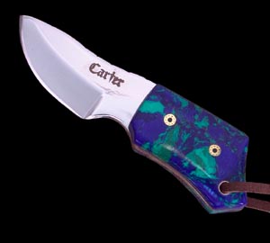 Gemstones offer unique colors and beauty but in reality natural gemstone is too brittle for practical use in knife handles. Reconstituted stone is made by combining crushed or powders natural stone with synthetic polymers and resins and reformed to make a much more durable and waterproof material while retaining the beauty of the gemstone. In some cases, completely manmade materials can be nearly impossible to tell from natural or reconstituted materials.